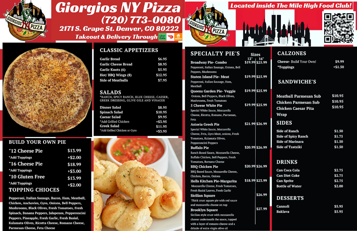 Welcome to Giorgios NY Pizza, where the essence of New York-style pizza comes alive in Denver! Located at 2171 S Grape St, this takeout and delivery-only gem has quickly become a favorite among locals. Customers rave about the consistently delicious offerings, with special mentions of the Broadway pie and the delightful garlic cheese bread that stands out as a must-try.